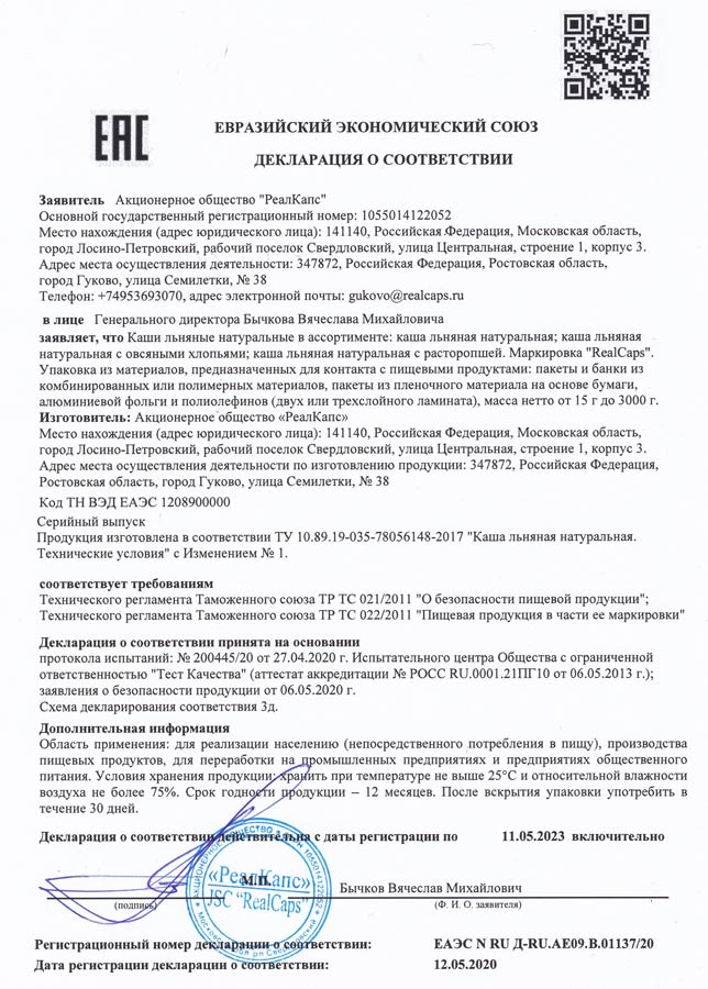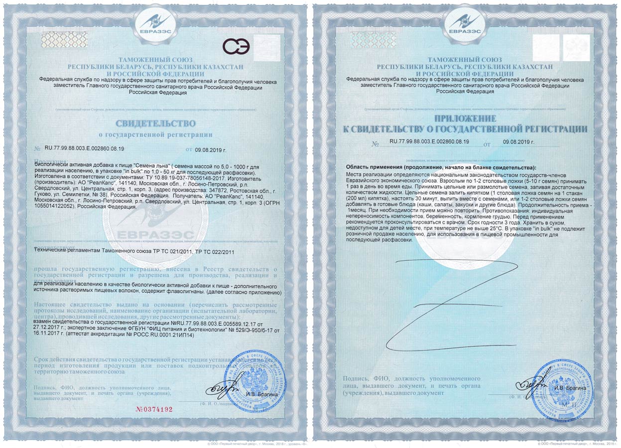 Dietary supplement "Flax seeds" has the registration of the Russian Federal Service for Surveillance on Consumer Rights Protection and Human Wellbeing (Rospotrebnadzor).